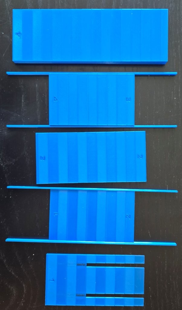 Exemple : la pièce 4 se colle avec la pièce 4-3, qui se colle ensuite avec la pièce 3-2, etc.